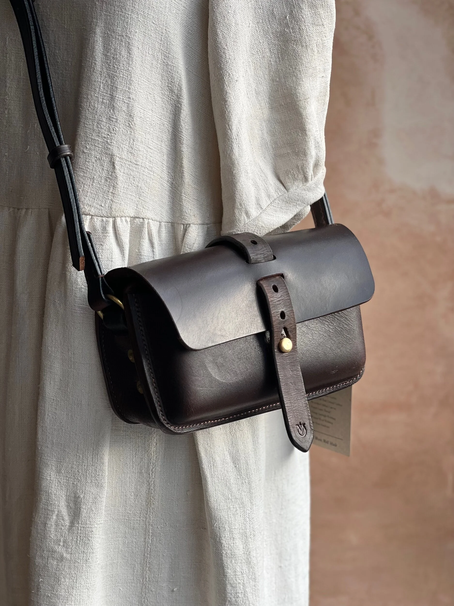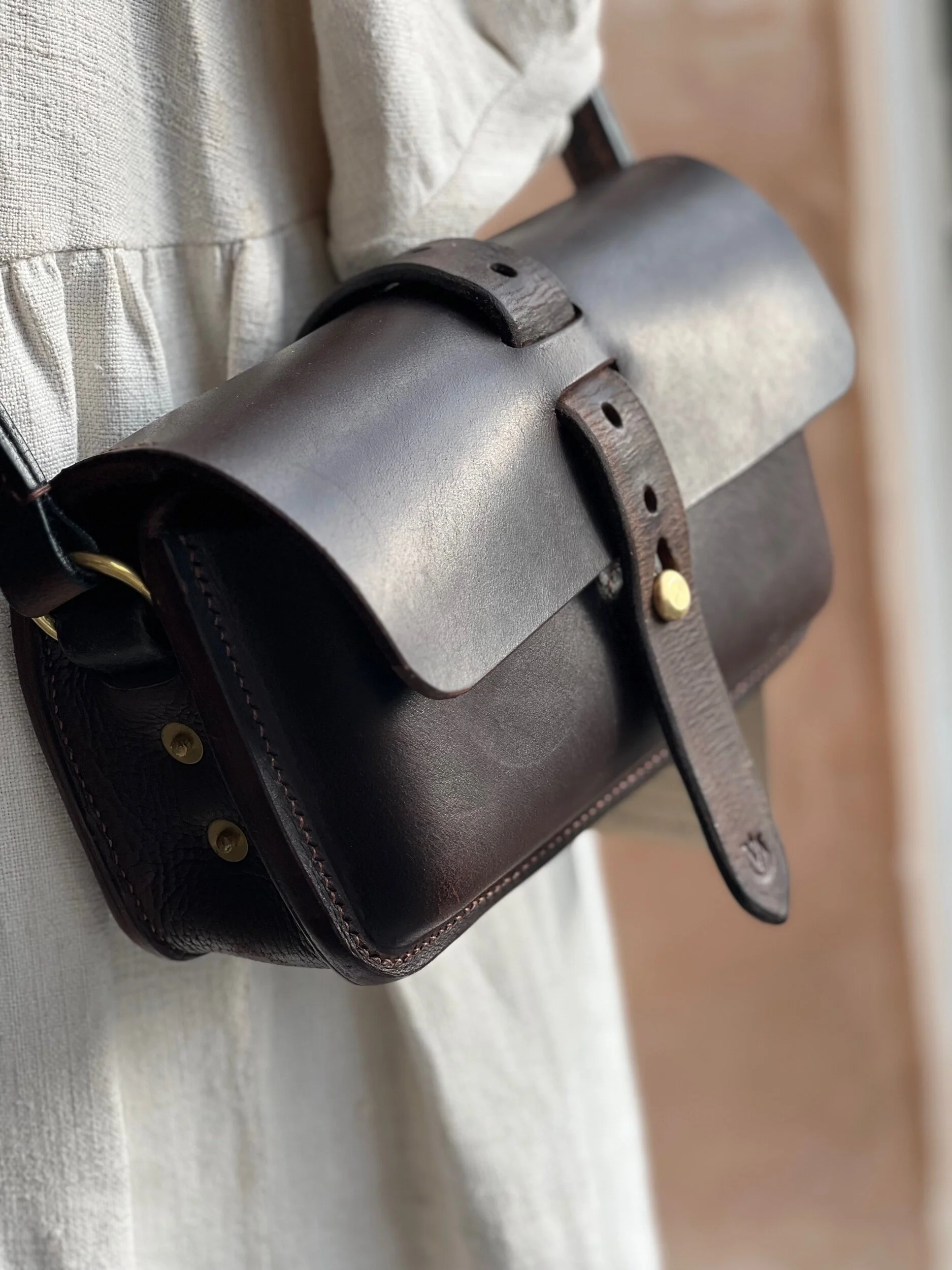 The interior has two compartments and a further slip pocket. The front section is moulded to give the distinctive curved lines. The bag is closed using a Sam Brown stud. The shoulder strap will be made to measure please add your preferred size at checkout.