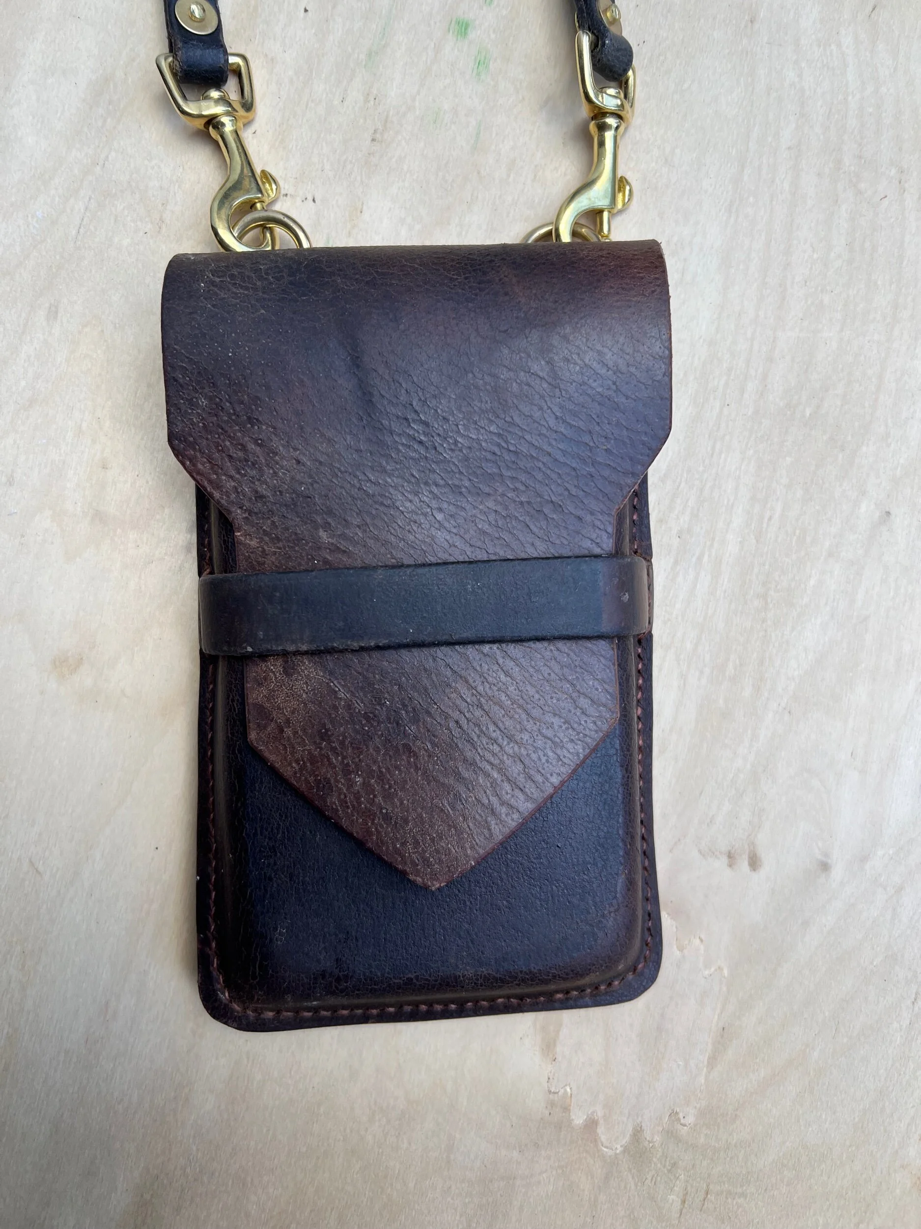 Beautiful moulded and hand stitched repurposed saddle leather phone case with adjustable and detachable shoulder strap, belt loops and a card holder pocket on the reverse.