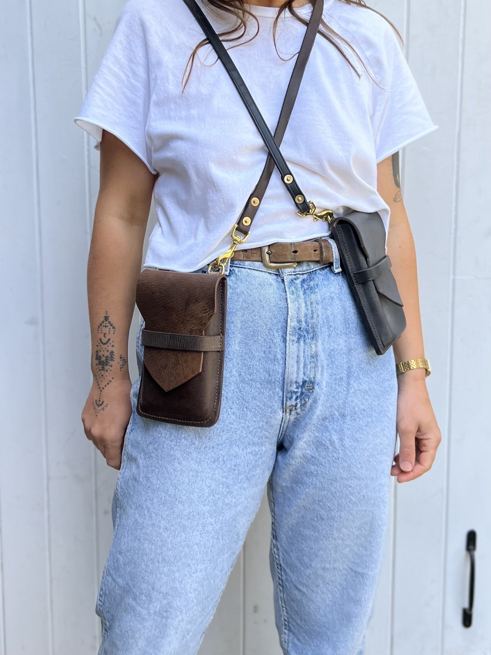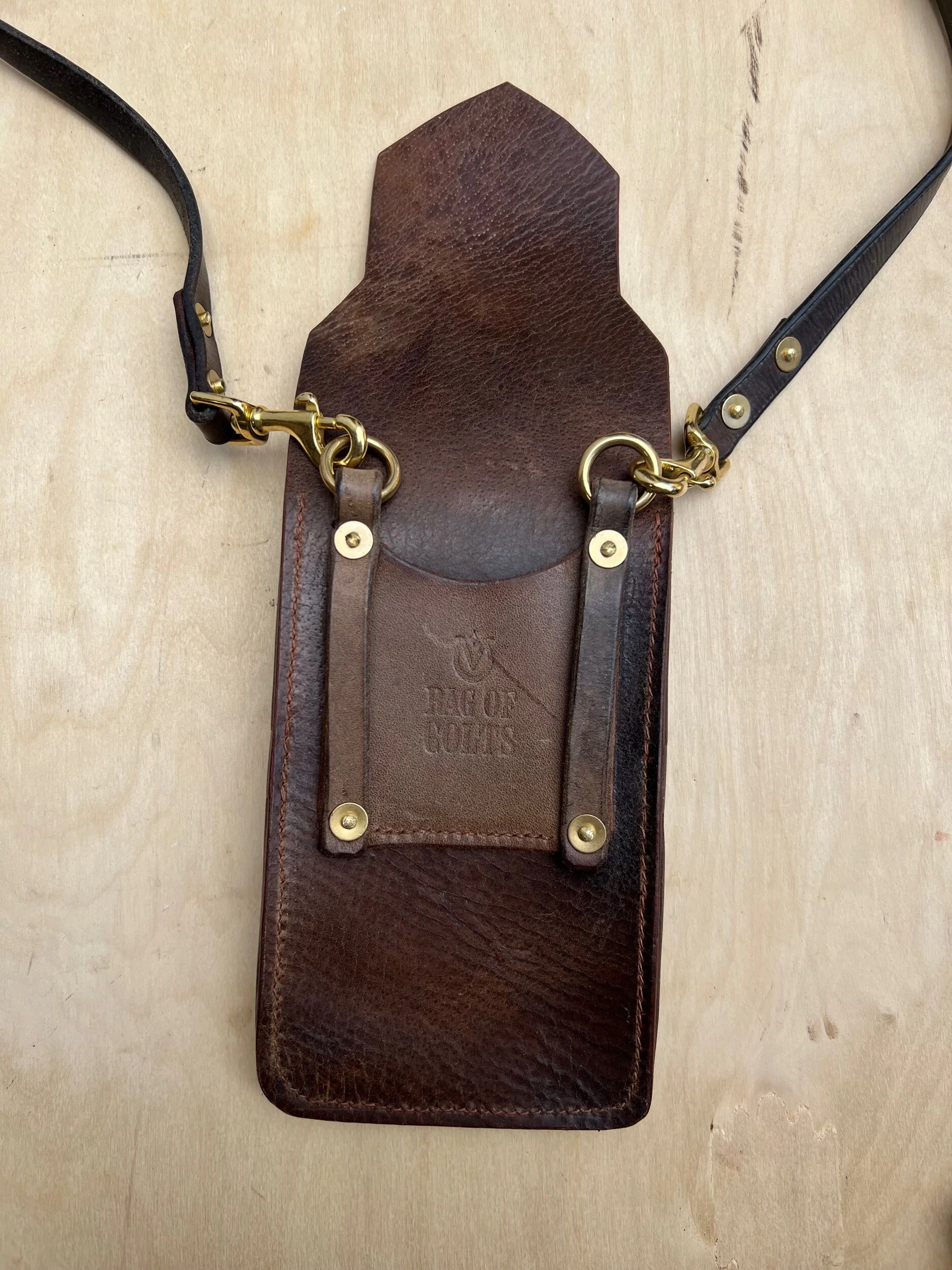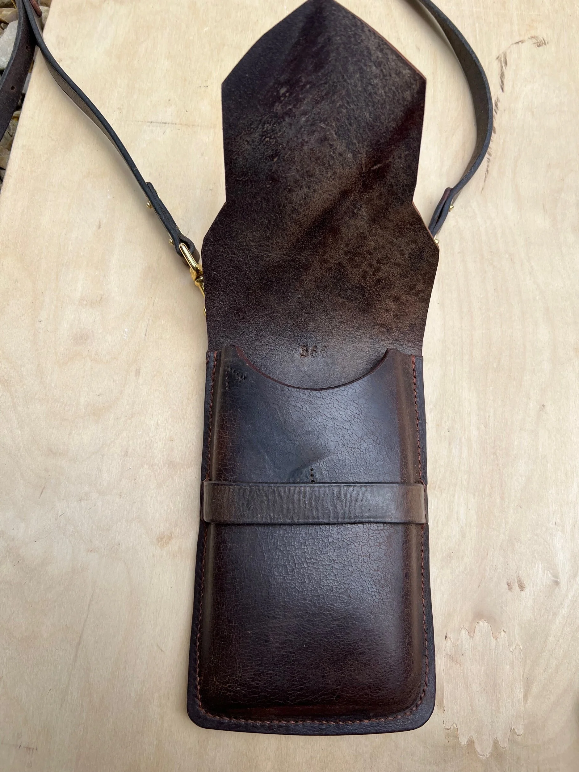 Beautiful moulded and hand stitched repurposed saddle leather phone case with adjustable and detachable shoulder strap, belt loops and a card holder pocket on the reverse.