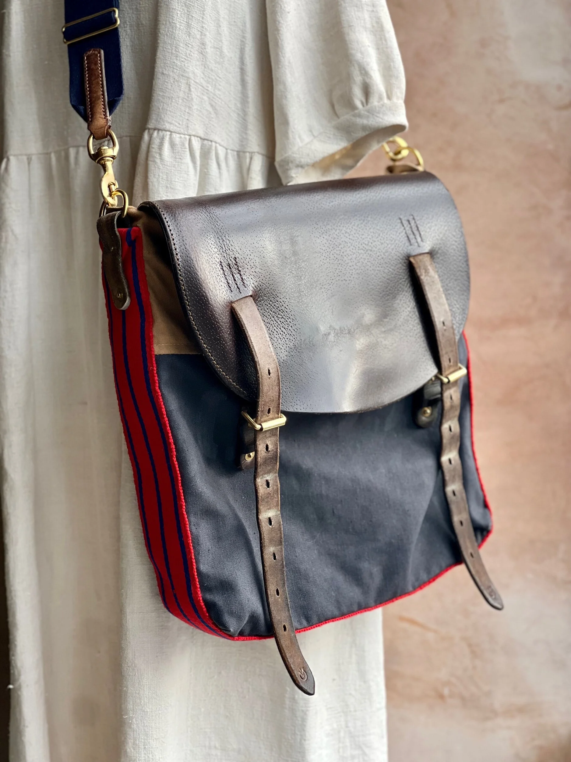 Navy and tan repurposed military canvas with wonderful subtle stencilling, trimmed with a dash of striped colour and paired with a piece of polished dark saddle leather.