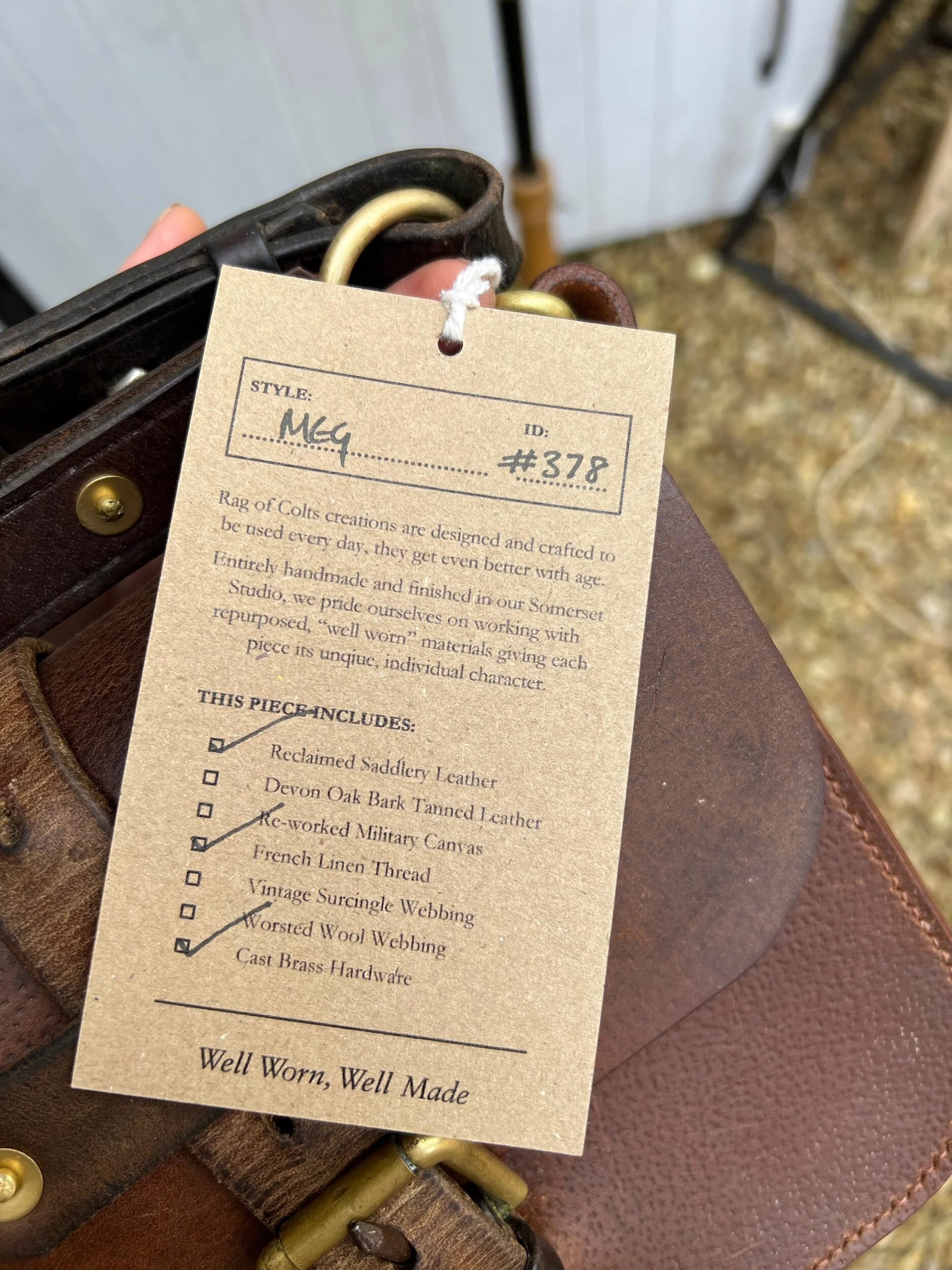 A Meg with a subtle difference. We have made a very small collection of Megs with antique harness buckles and we are very happy with the result. This one is particularly lovely - an unusually warm chestnut toned vintage leather is paired with a vintage raw hide strap. Please see all the photos to really appreciate it :)