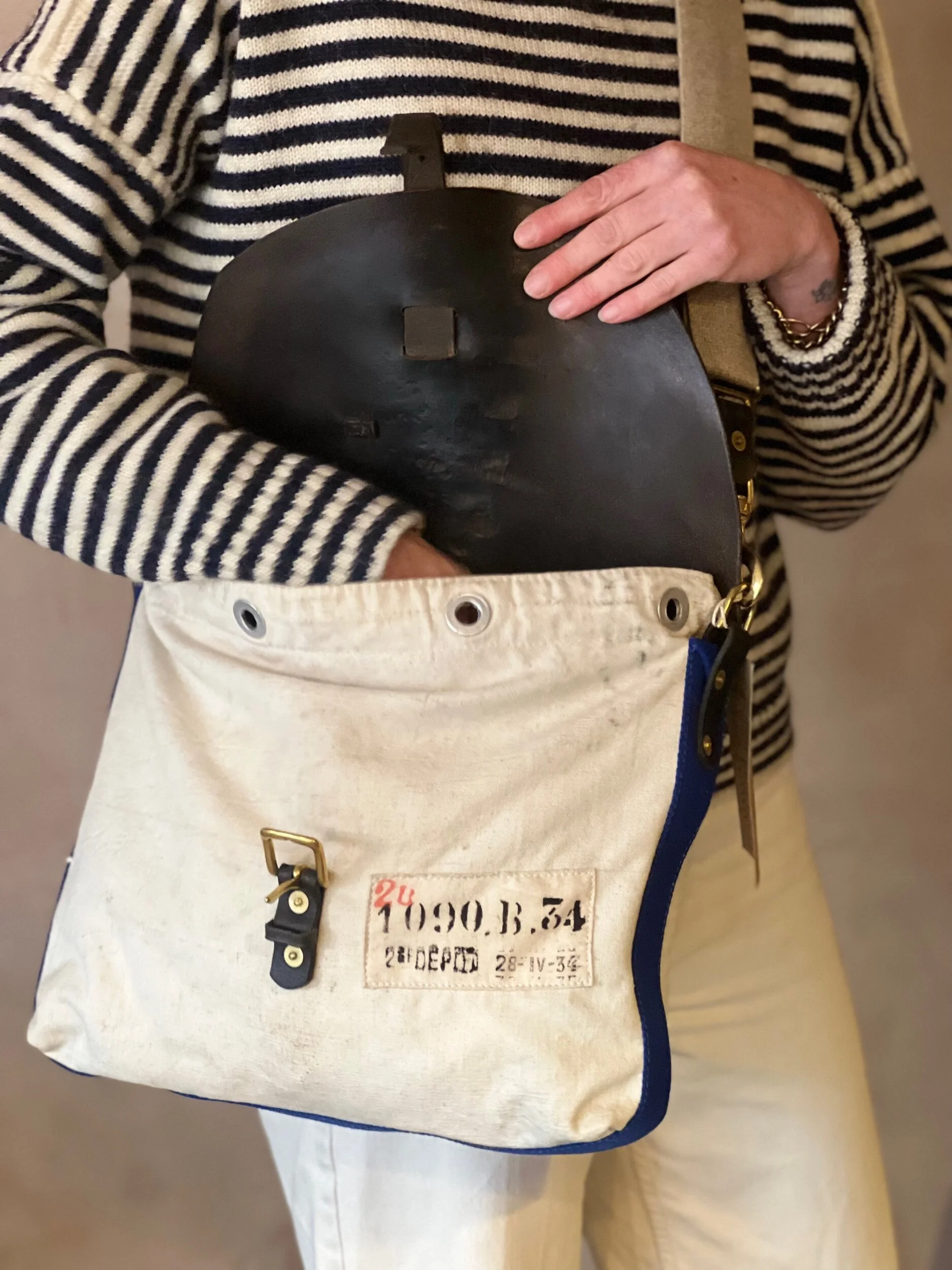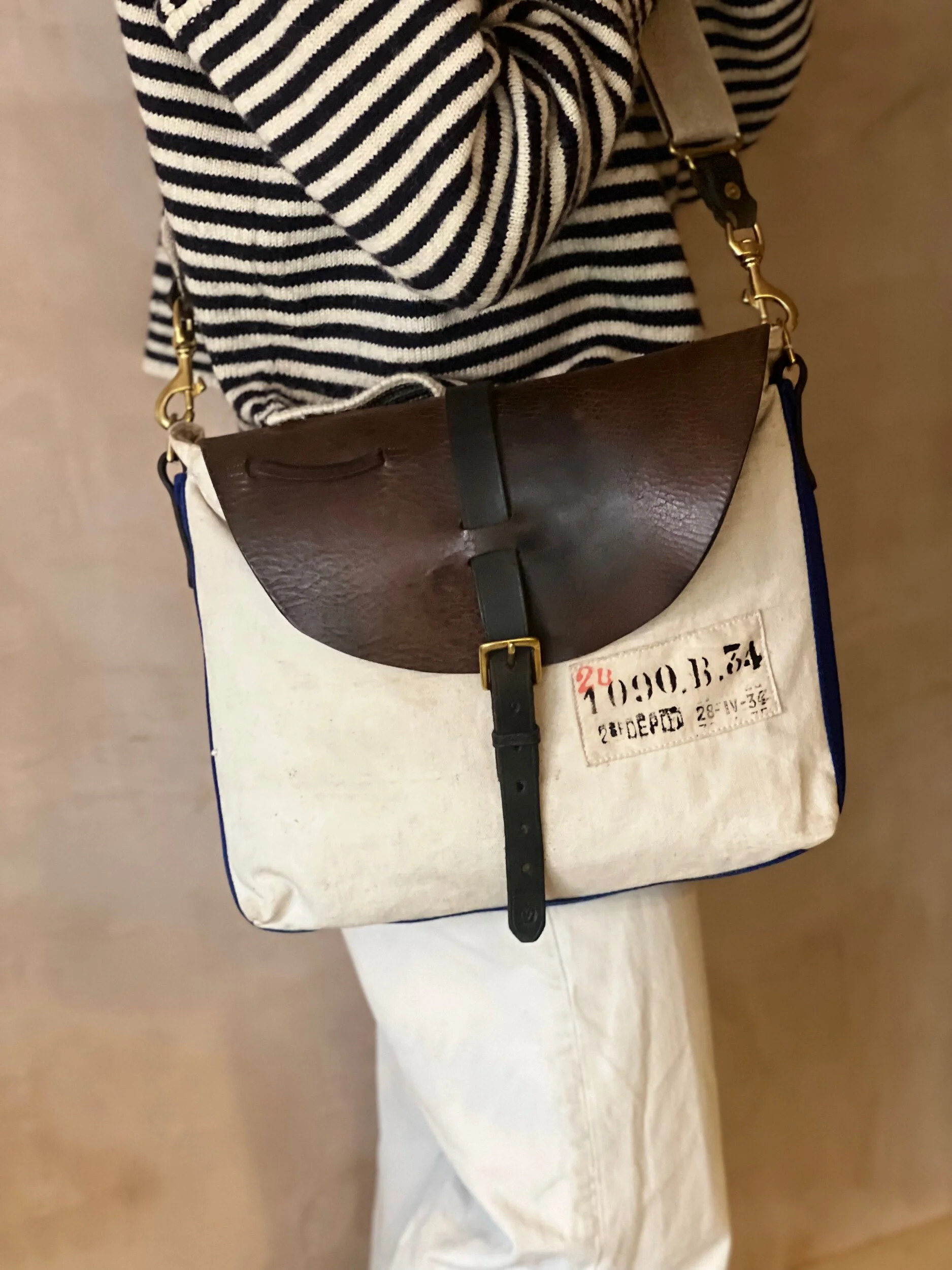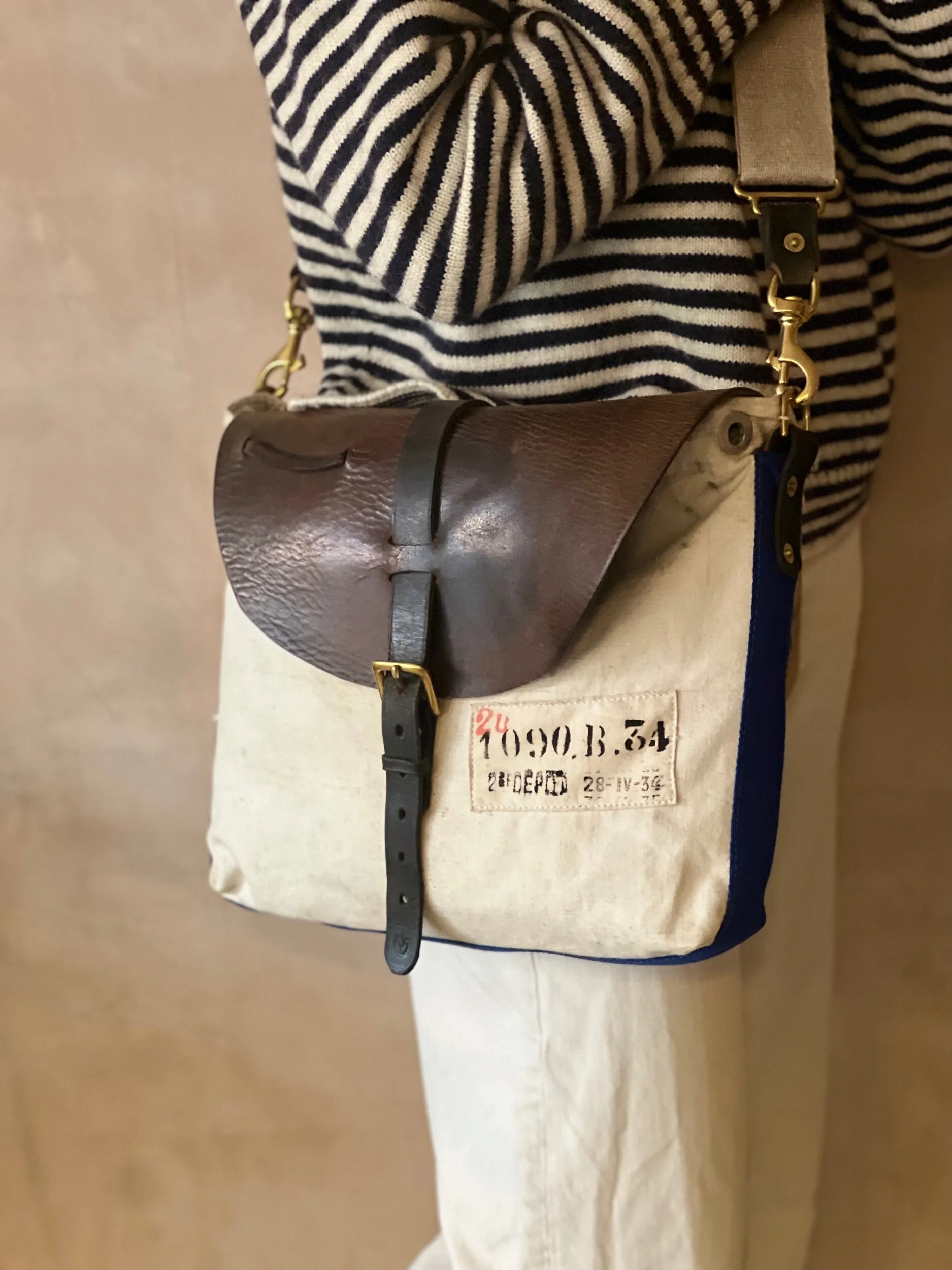Lovely smaller size vintage natural canvas satchel bag with original stamped details paired with a beautifully worn saddle saddle leather flap and repurposed strap to secure. Trimmed with a flash of bright blue worsted wool webbing.